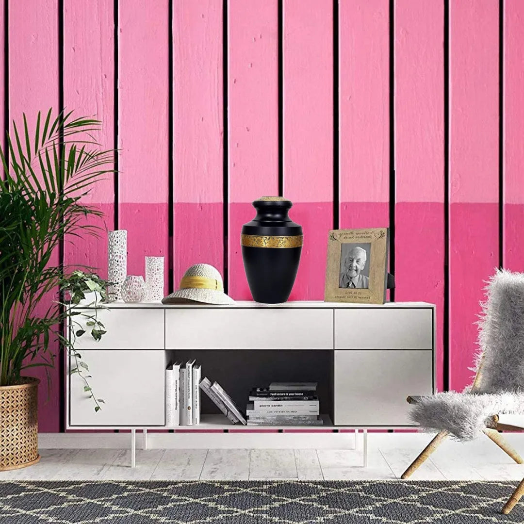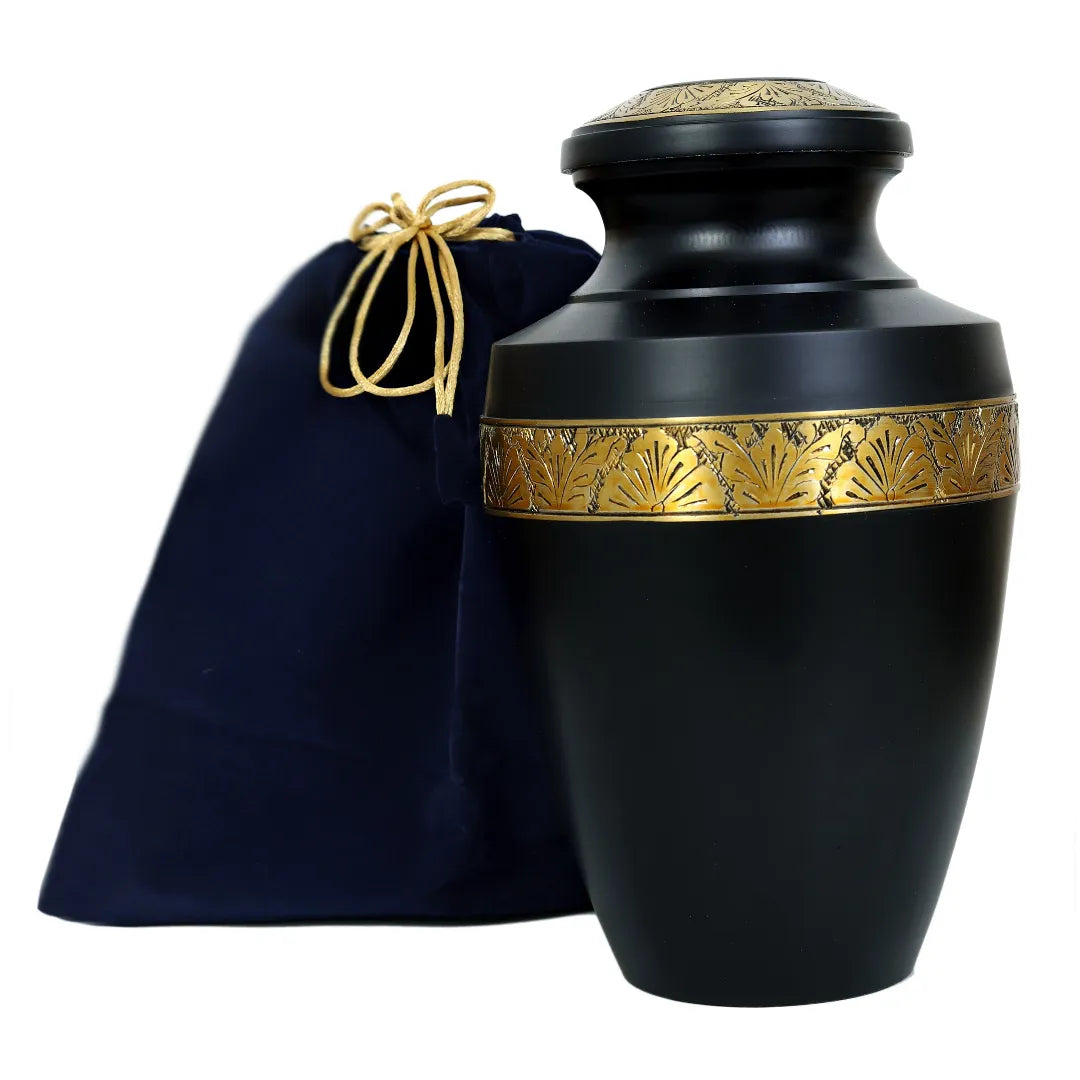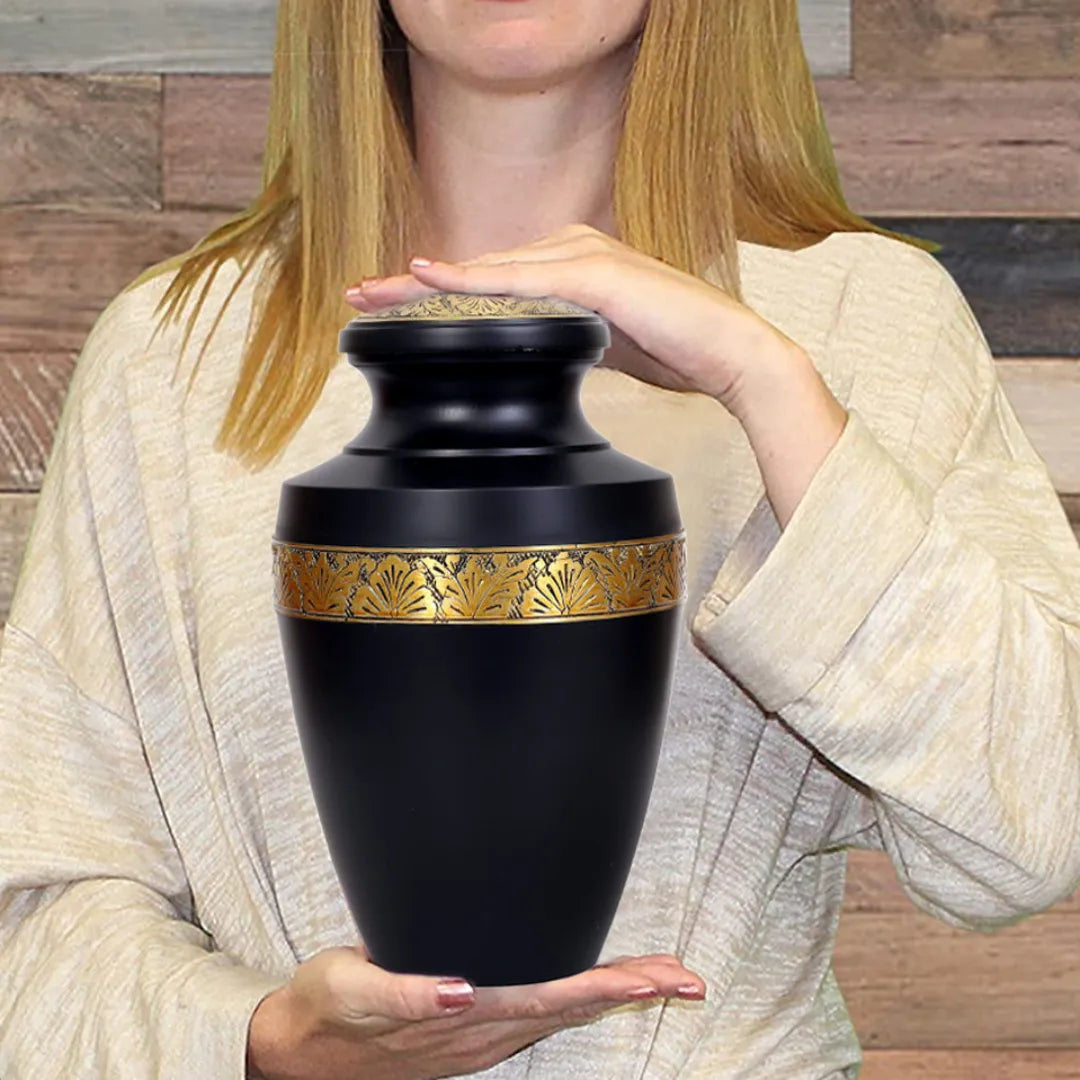 Honor a cherished life with timeless elegance using our black and gold cremation urn. This striking piece features a sleek matte black finish adorned with intricate gold engraving around the center, offering a dignified tribute filled with love, respect, and enduring memory. Designed to resemble the sophistication of ceramic urns, it delivers the lasting durability of premium metal, making it a beautiful and practical choice for long-term preservation.