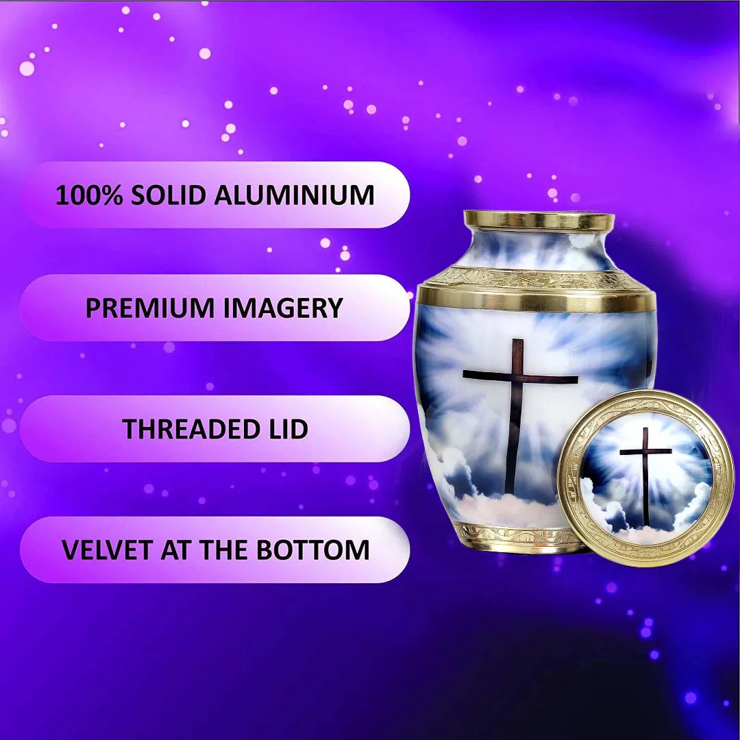 Honor a life of faith and love with one of our most stunning modern cremation urns, designed to offer comfort, dignity, and lasting tribute. This radiant urn features a golden cross emerging through heavenly clouds—symbolizing peace, eternal rest, and divine connection. Its spiritual imagery makes it a standout choice among urns for cremation remains, whether for an individual or as part of a matching set of urns for couples ashes.