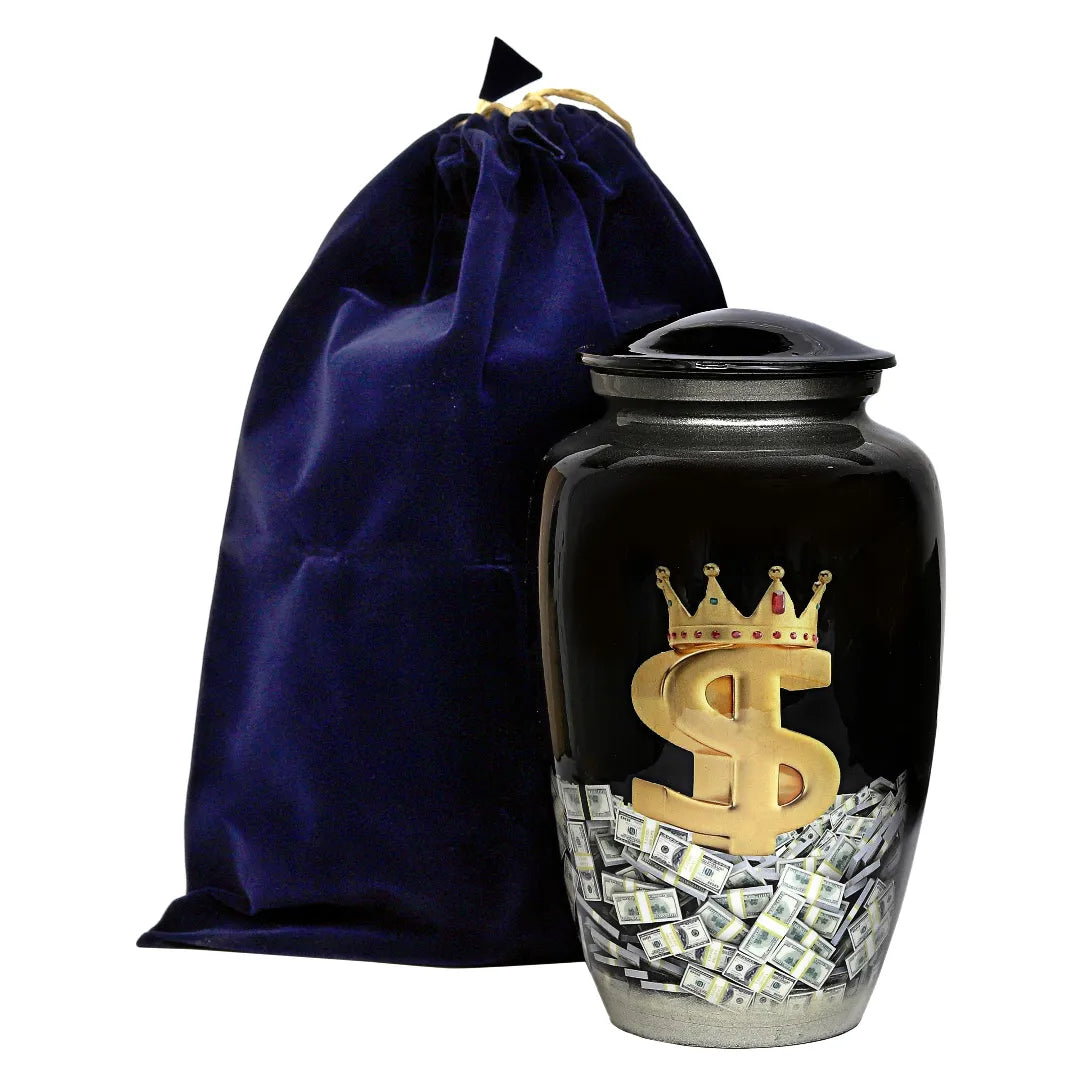 Celebrate a bold life with one of the most unique cremation urns for ashes available today. This striking urn features a dramatic design of a golden dollar sign crowned with jewels, surrounded by stacks of cash—a perfect tribute for someone who lived large and left a legacy of ambition, power, or humor. Crafted to stand out, this urn reflects a modern take on memorialization and makes a strong statement among more traditional urns for human ashes.