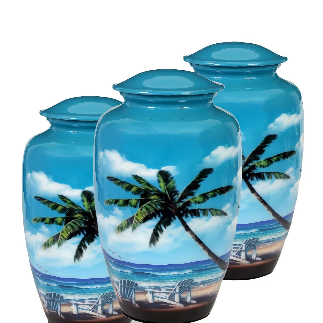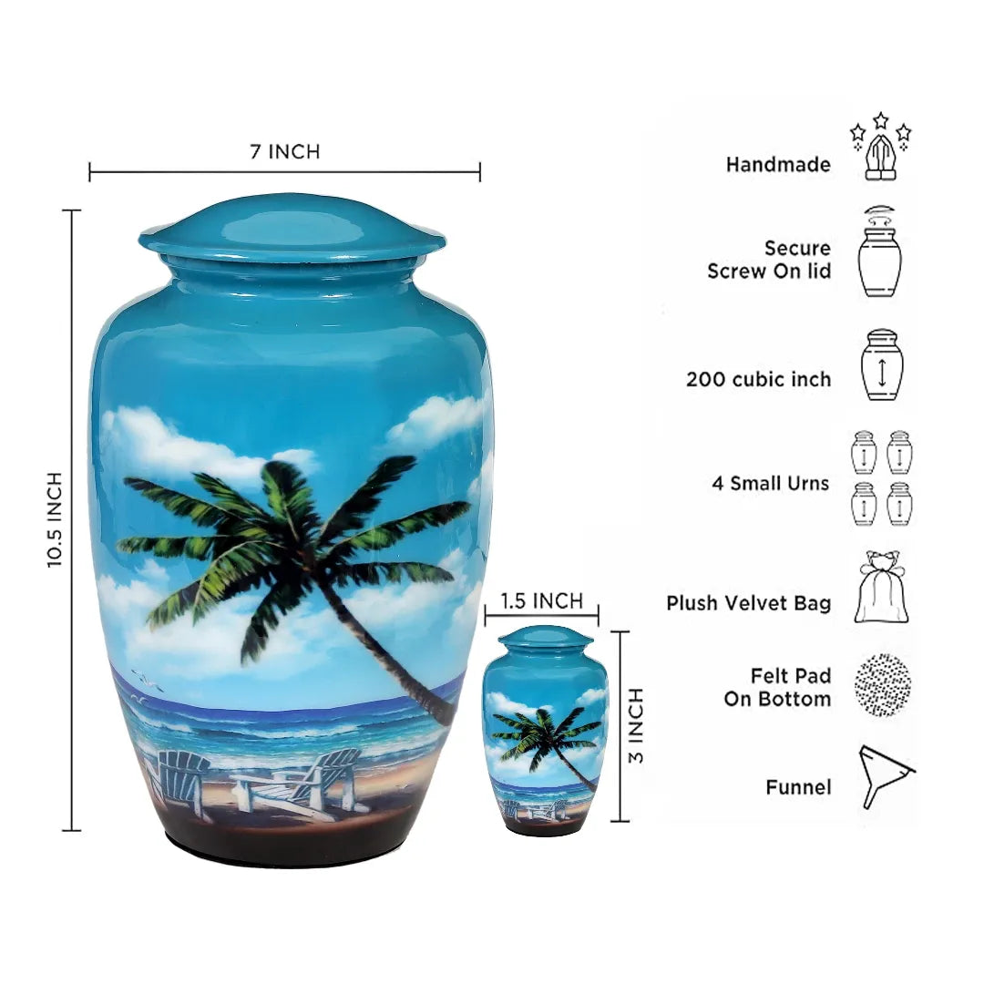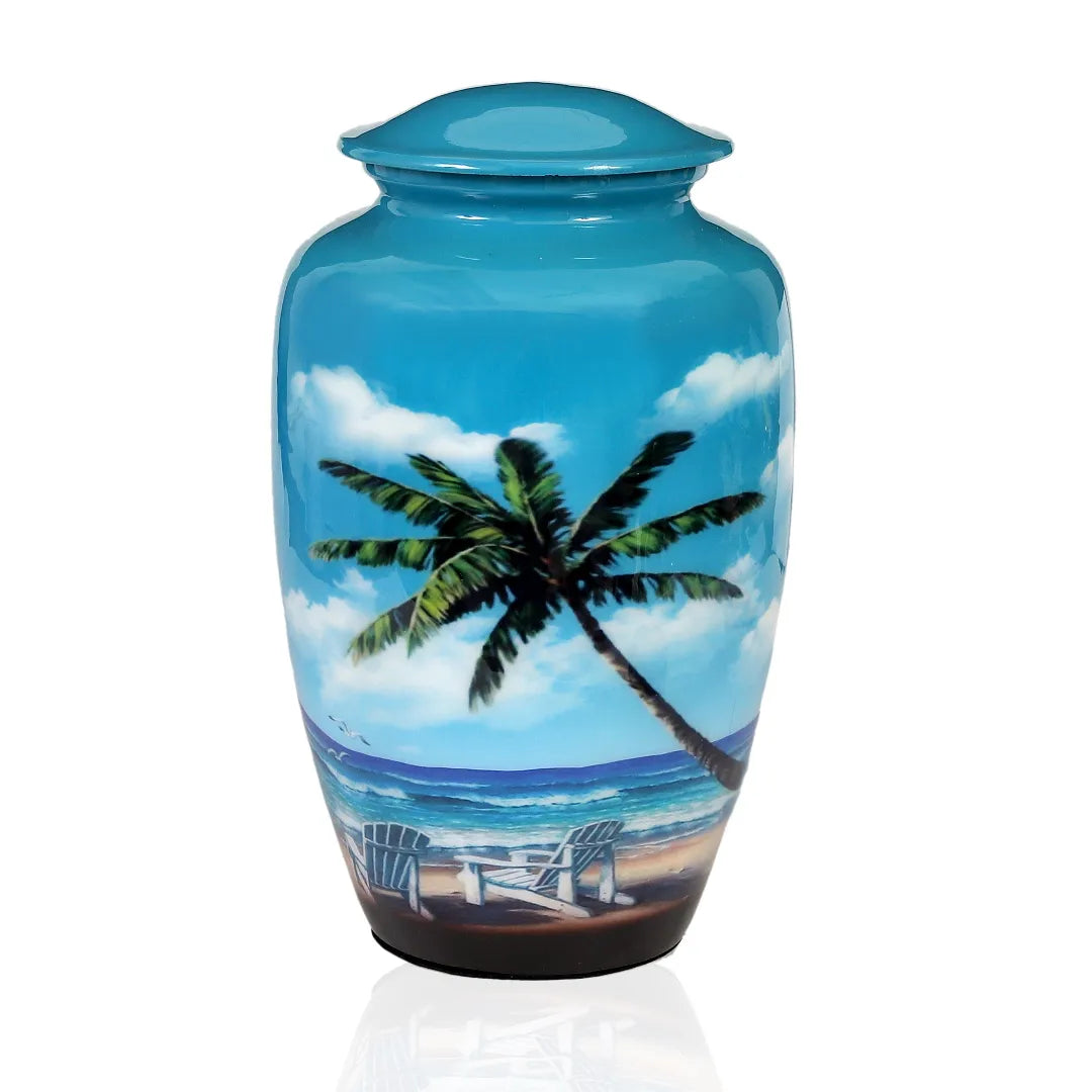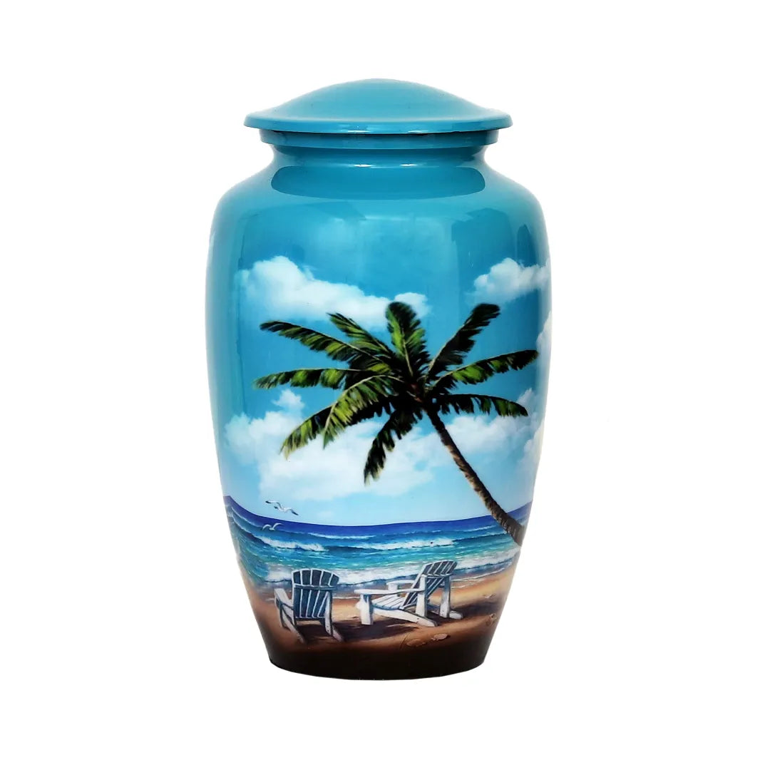 Honor a life well lived with this beautifully hand-painted cremation urn, designed to offer peace and reflection. Showcasing a tranquil tropical beach scene—complete with swaying palm trees, soft ocean waves, and two empty chairs gazing into the horizon—it evokes serenity, eternal rest, and connection with nature. Each detail of the landscape is carefully rendered in calming shades of blue, creating a soothing visual experience. This urn is a meaningful tribute for anyone who loved the sea, found peace in natural surroundings, or simply appreciated quiet, contemplative moments.