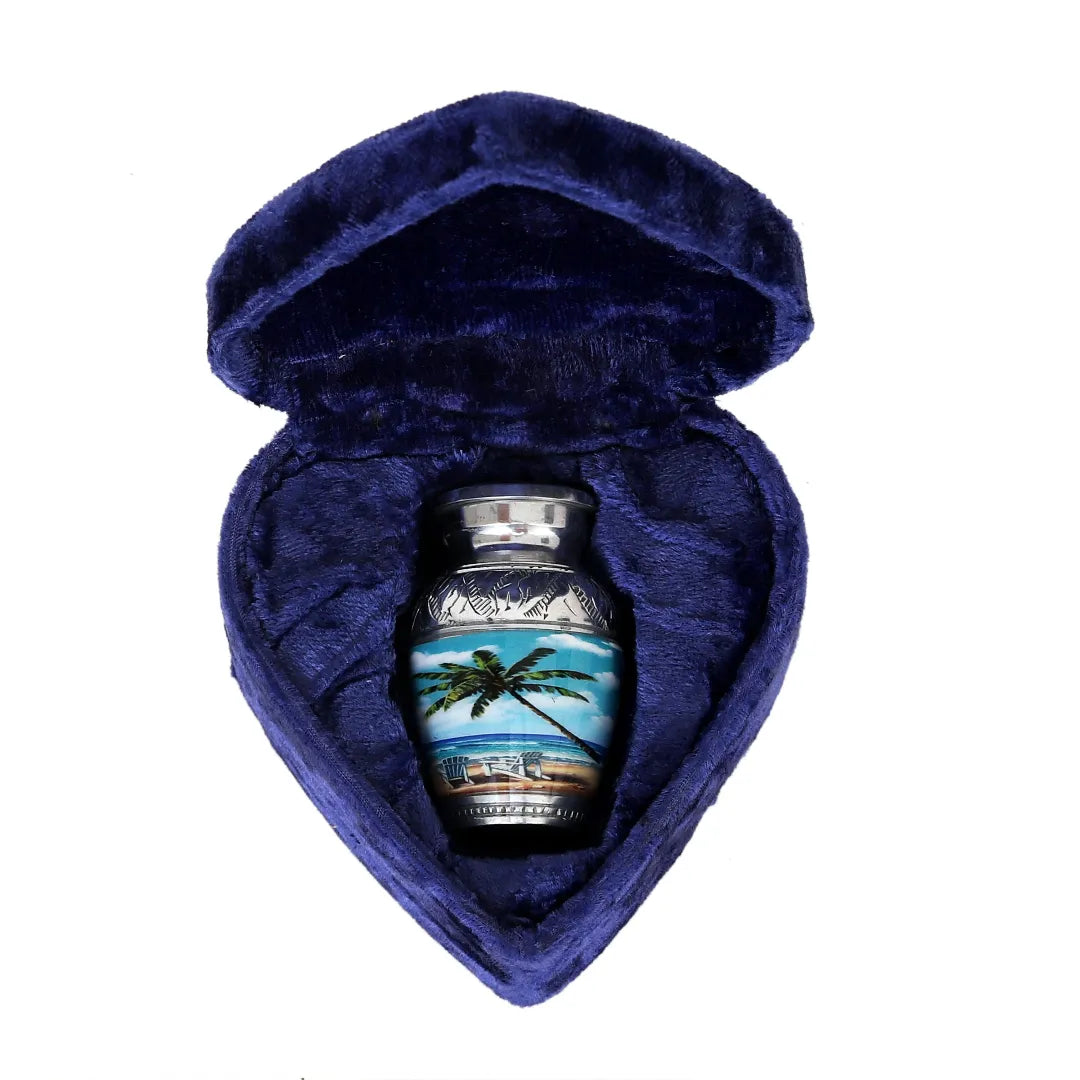 Honor your loved one with this beautifully handcrafted beach-themed cremation urn, designed to bring peace and comfort. The tranquil scene features palm trees, ocean waves, and a calming shoreline that evokes memories of serenity and joyful moments spent near the sea. Whether you're remembering a beloved family member or a cherished pet, this urn serves as a gentle, elegant tribute. Its detailed craftsmanship and soft color palette make it a fitting piece for any memorial setting, whether displayed at home, during a service, or placed in a columbarium.