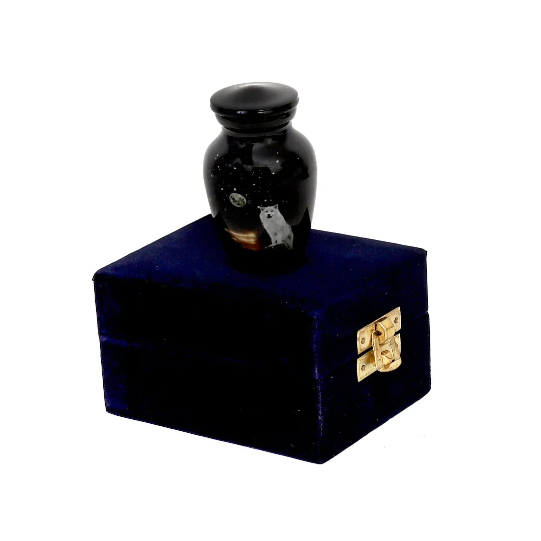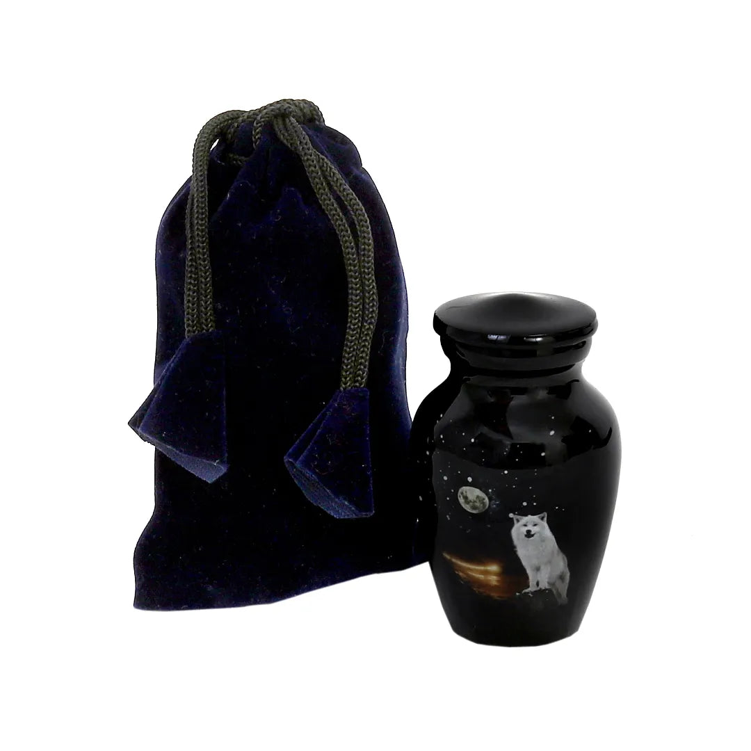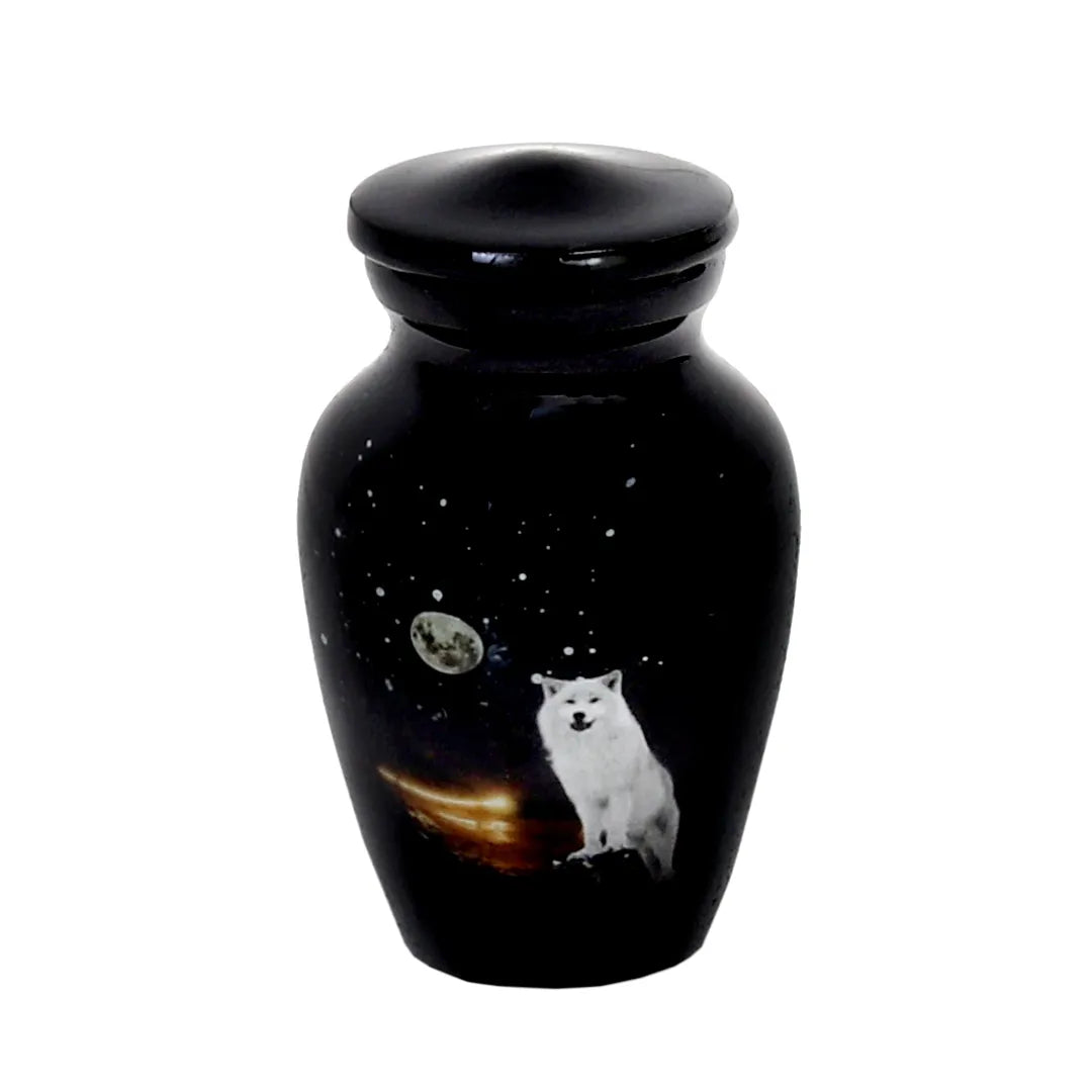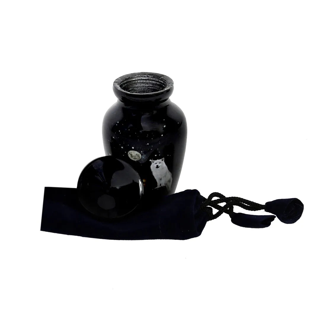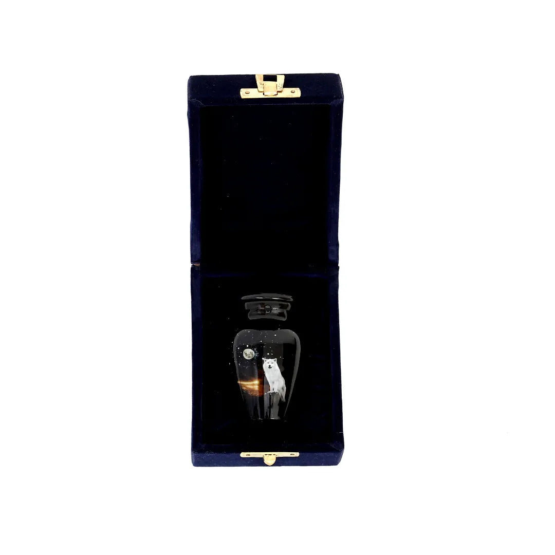 This handcrafted keepsake is a standout among cremation urns for ashes, offering both visual beauty and emotional comfort. Designed with a glossy black finish and a serene white wolf beneath a celestial moon, this urn represents strength, guidance, and peace—ideal qualities for honoring a loved one’s memory. Its compact design makes it suitable for holding a small portion of ashes, whether shared among family members or kept in a personal space for remembrance.